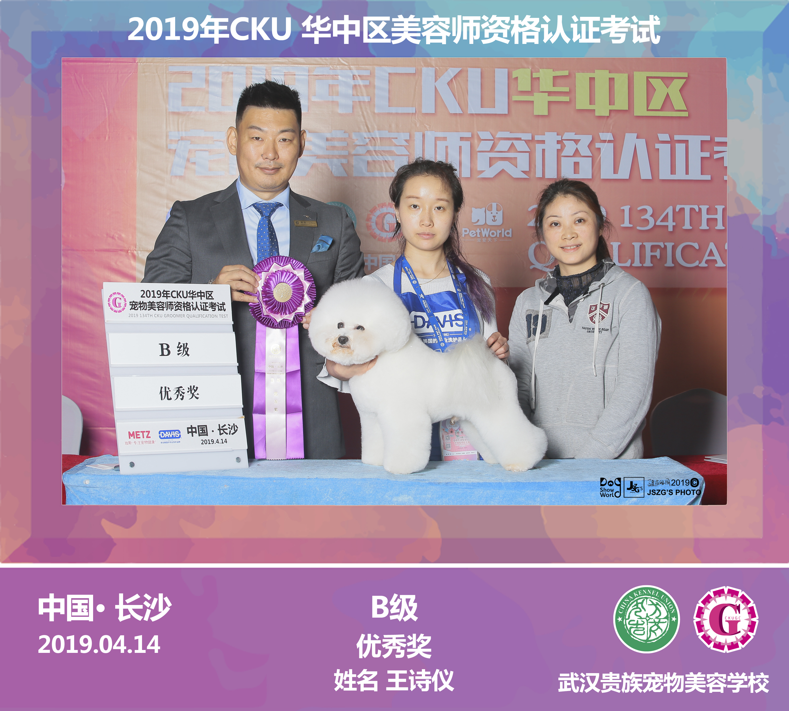 武漢貴族寵物美容培訓學校優秀學員王詩儀同學榮獲2019年CKU美容認證考試B級優秀獎
