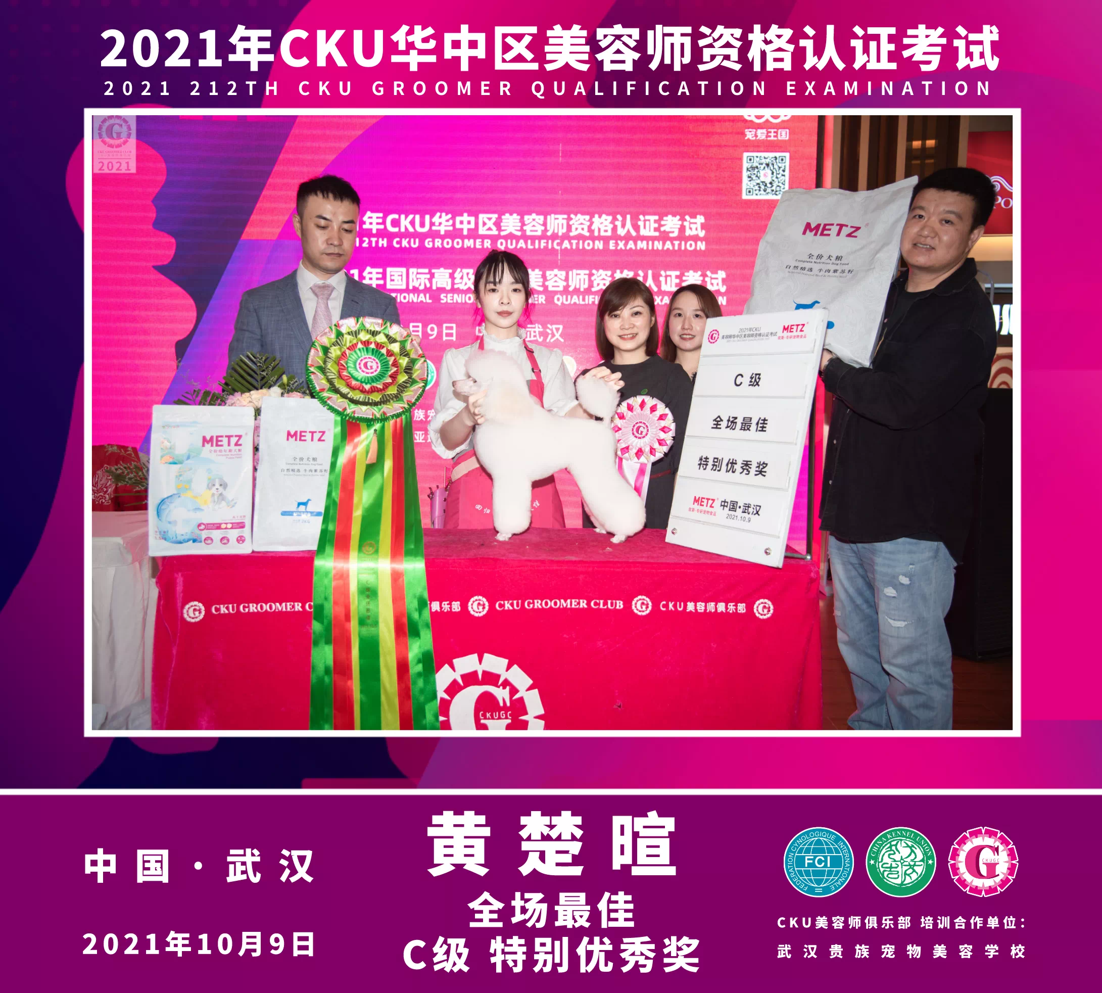 武漢貴族寵物美容培訓(xùn)學(xué)校優(yōu)秀學(xué)員黃楚暄同學(xué)榮獲2021年CKU美容認(rèn)證考試C級(jí)特別優(yōu)秀獎(jiǎng)及全場(chǎng)最佳